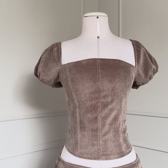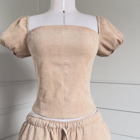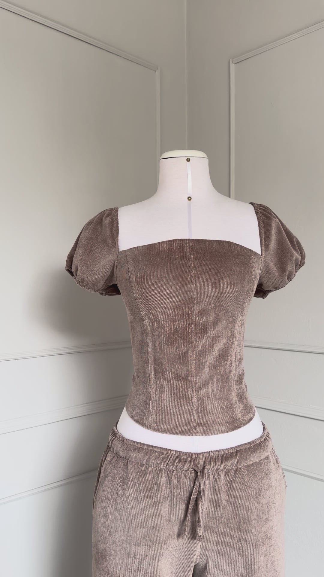 Top con corset estructurado, ajuste regulable en la espalda y detalle multiaguja en el cuerpo. Diseñado con mangas cortas abombadas con elástico para un acabado femenino y elegante.